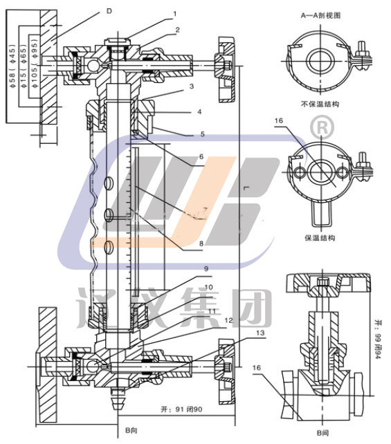 9.壓蓋螺母 10.底環‖  11.鋼球 12.下閥 13.排污接頭 14.保溫管 15.平焊法蘭 16.標牌